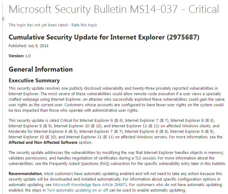 - Click the link in the Bulletin ID field. The Security Bulletin for that patch opens. In this example, Security Bulletin MS14-037 opens: