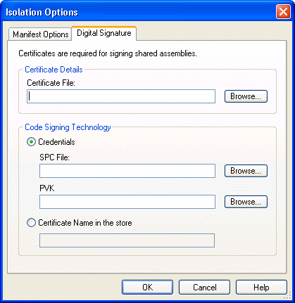 Digital Signature Options—Configure the certificate information required when using shared assemblies. See Digital Signature Tab. noteThe modifications you make on the Isolation Options dialog box will be recorded in the isolationconfig.ini``file, which is stored in theAdminStudio Shareddirectory.