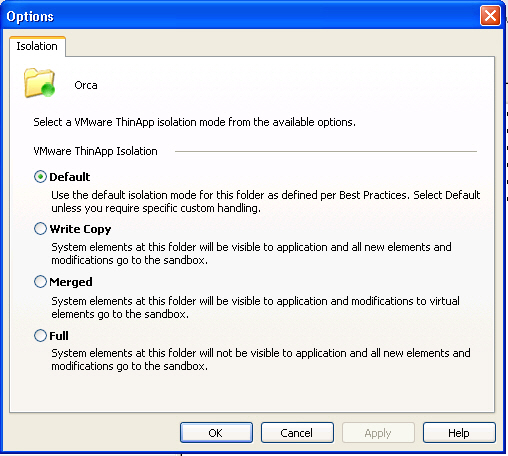 | Full | You would use Full isolation when a ThinApp application needs to run on a machine where earlier or later versions of the same application are either installed or were not uninstalled correctly. For directories and registry keys that have Full isolation, the ThinApp application will not be aware of any host computer file that might exist, and it sees only virtual files and registry keys at fully isolated locations. |