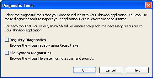 | File System Diagnostics | Select this option if you want to be able to browse the ThinApp application’s virtual environment file system using a command prompt. |