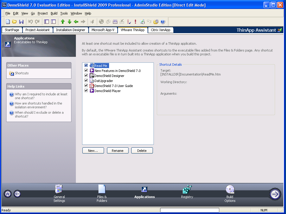 By default, the ThinApp Assistant creates ThinApp applications for all of the executable shortcut that exist in your project. The project’s shortcuts are listed in a checklist on the Applications page.