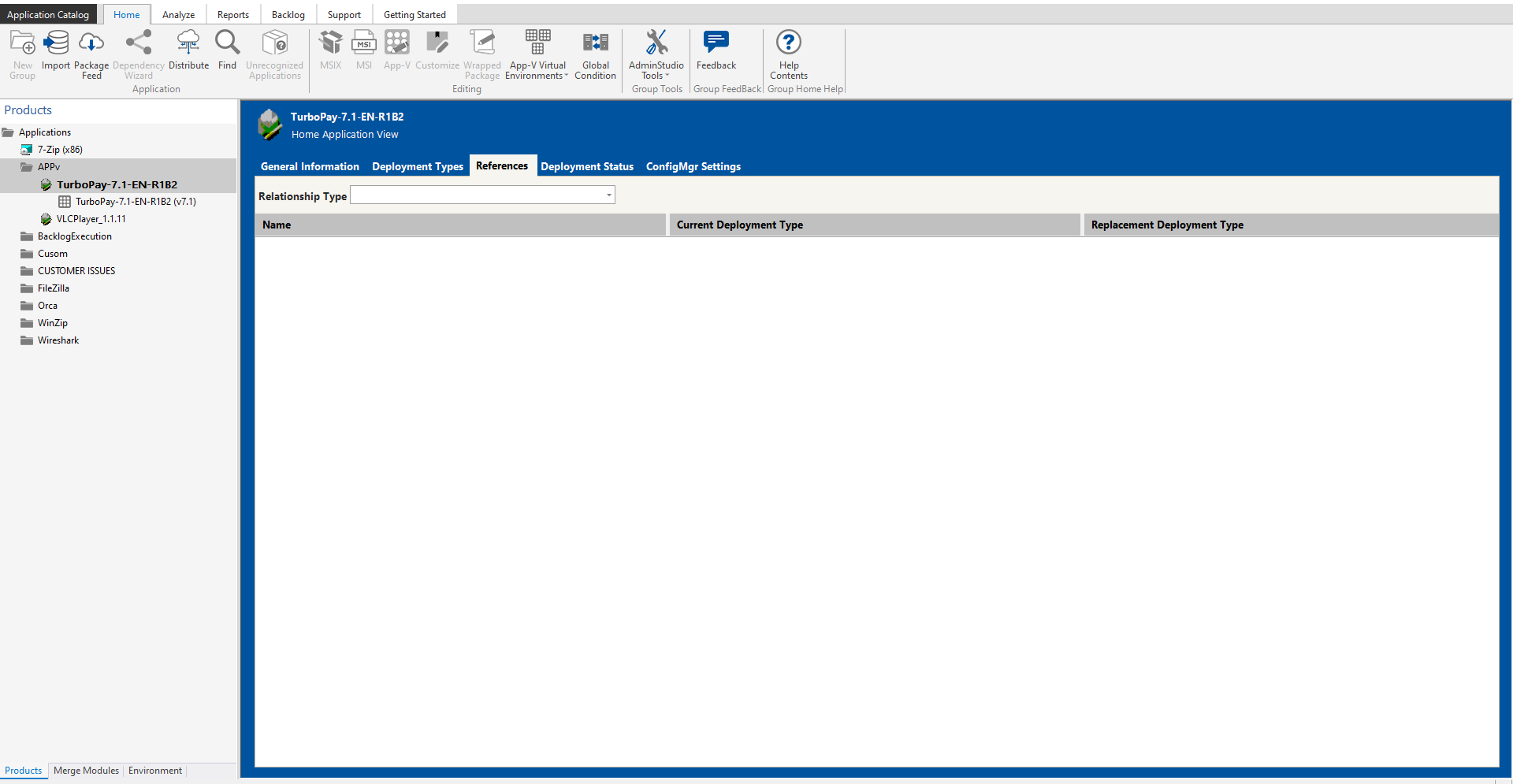 On the References tab of the Home Application View, you can view a list of packages that are dependent upon this application or that supersede this application. These dependencies are defined on the Dependencies and Supersedence subtabs of the Deployment Data of the Home Deployment Type View for a selected package. If another package has specified that it is dependent upon or supersedent to this package, that package will be listed here.