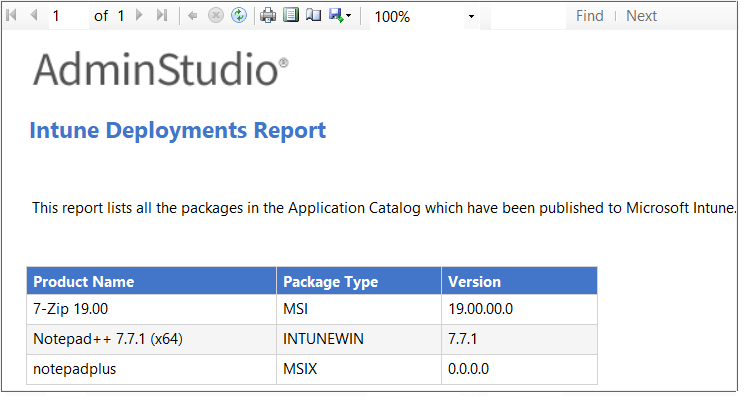 The Intune Deployments Report on the Reports tab lists the packages in the Application Catalog which have been published to Intune.
