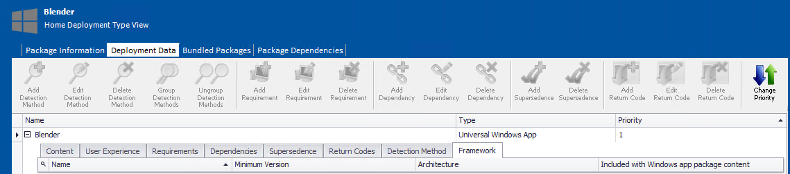 When you have a Windows Store mobile app deployment type selected in the Application Manager tree, the Framework subtab of the Deployment Data tab of the Home Deployment Type View is displayed, and displays any customizations that may have been added to this Windows Store mobile app.