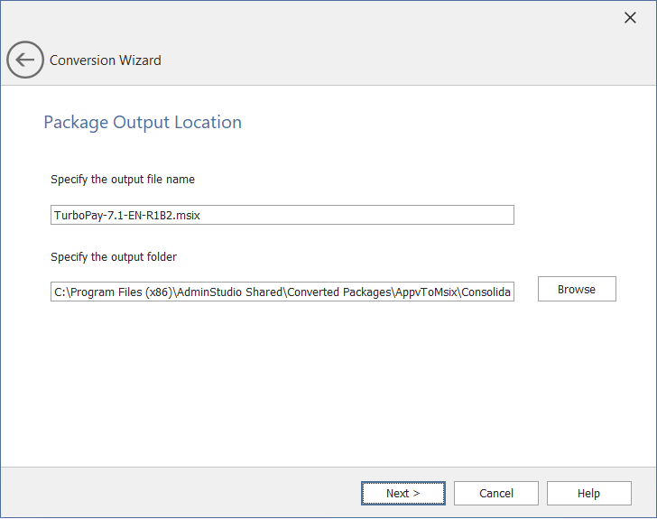 noteThe Package Output Location panel and the Certificate Information panel appear when a single package is selected for conversion. These panels will not be displayed if multiple packages are selected or if the Conversion Wizard is launched from either application node or group node. The information configured in the Appv to Msix Conversion Plugin will be populated when you launch Conversion Wizard from the package node.