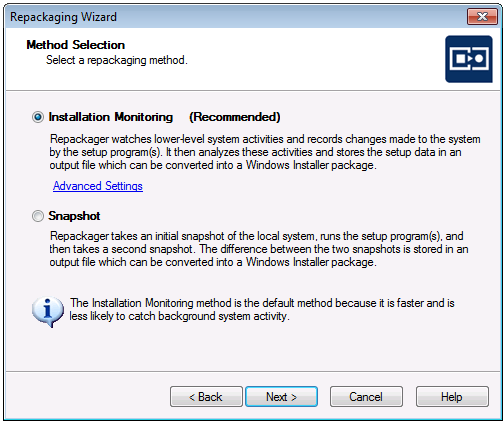 | Installation Monitoring | Installation Monitoring watches all activities generated by an installation, and then determines the files, .ini files, registry entries and shortcuts that should be included in the generated Windows Installer package. Installation Monitoring is significantly faster than the Snapshot repackaging method. If there are services running on the machine that have nothing to do with the installation being repackaged, click the Advanced Settingslink to open the Excluded Processes Dialog Box, where you can choose to exclude those processes. The Installation Monitoring Method is included with AdminStudio Professional and Enterprise Editions. If you know that the installation that you are capturing is from a self-extracting .exe file and if you want to use the Installation Monitoring method, you should click Advanced Settings and add the name of that .exe file to the excluded processes list. |