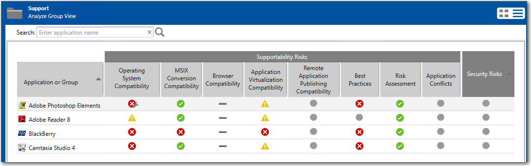 - When issue resolution and reimporting is complete, look at the Analyze Group View, Application View, or Deployment Type View of the package, application, or group that you tested. You will see that the Error With Fix and Warning With Fix icons have been replaced with the status icon with the next highest level (as described in Hierarchical Level of Status Icons) in that test category.