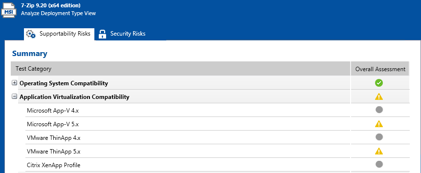 The Application Virtualization Compatibility tab of the Analyze Deployment Type View lists all of the individual errors, warnings, and informational messages that were generated when application virtualization compatibility testing was performed.