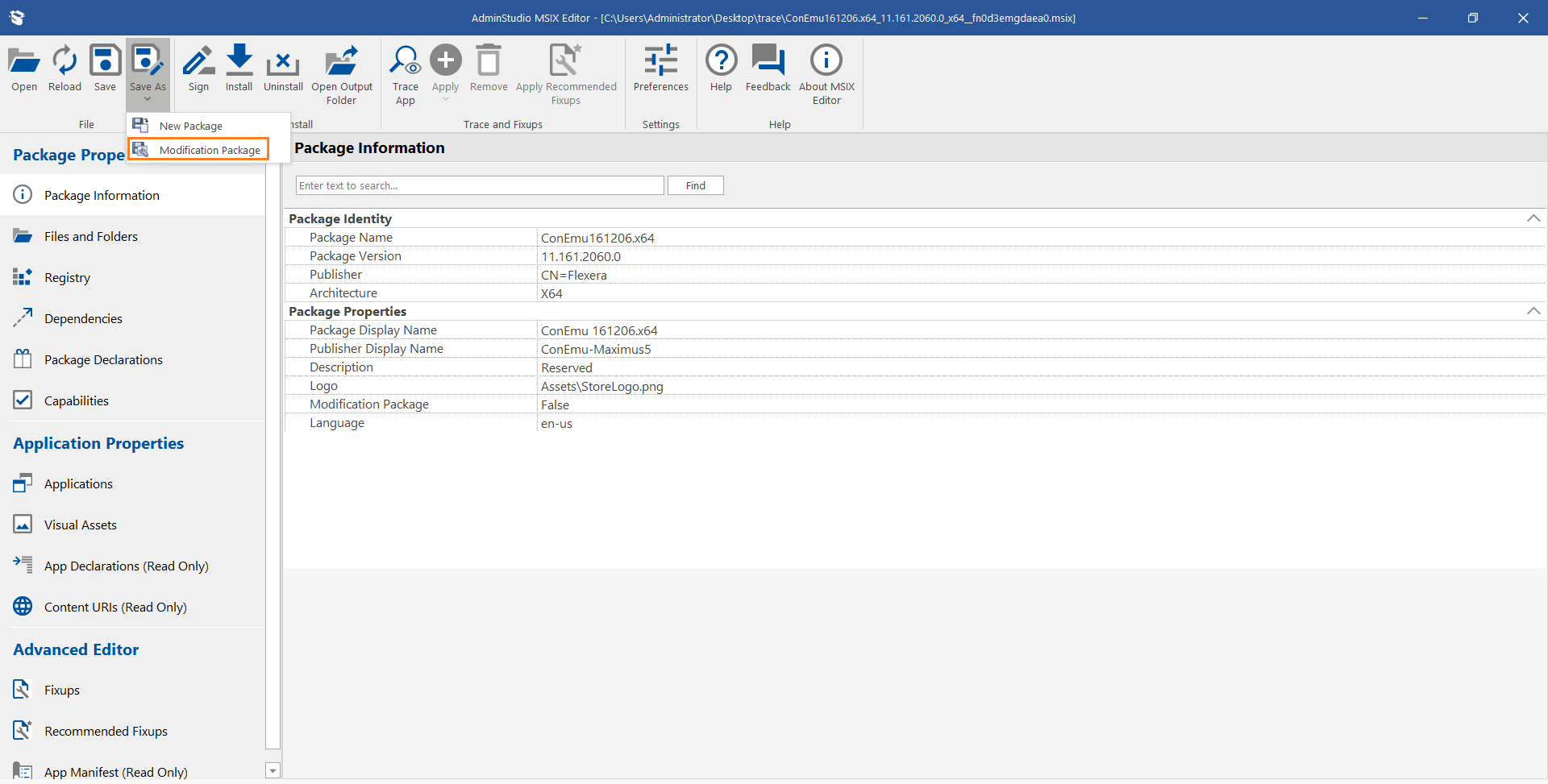 After editing the MSIX package, you can save the package as a modification package. To save a package as a modification package, perform the following steps: